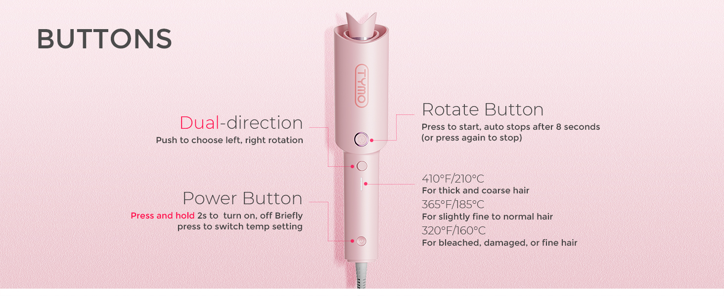 TYMO CURLPRO is equipped with intelligentanti-tangling and anti-scalding designs, ensuring a hassle-free and safe styling experience with your automatic rotating curling iron.